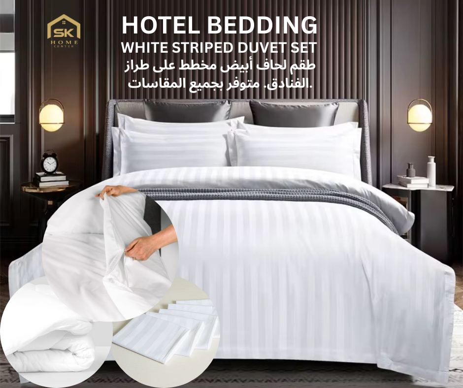 1. لحاف أبيض مخطط من نوع الفندق: من المحتمل أن يكون هذا لحافًا بتصميم أو نمط يتميز بخطوط بيضاء. يشير مصطلح "نوع الفندق" إلى مستوى معين من الجودة والراحة، يشبه ما قد تجده في الفندق.